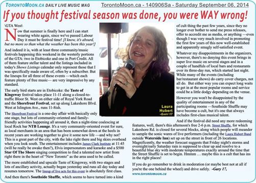 And if the festival did need any more redeeming features, well, there’s this afternoon’s free 2-6 p.m. Street Shuffle, for which Lakeshore Rd. is closed for several blocks, along which people will meander to sample the sonic wares of live performers (including the Laura Hubert Band outside Waterside Inn) set up on the street in front of 26 locations.