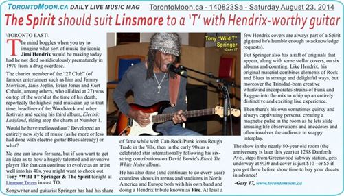 9:30> Tony “Wild T” Springer & The Spirit @ Linsmore Tavern, 1298 Danforth Ave., TO East ~electric Blues; $5 adv., $10 door